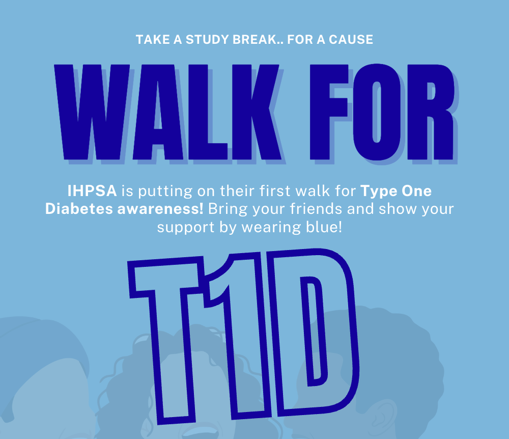 IHPSA is hosting a walk for Type One Diabetes awareness on Tuesday, April 7th. Meet us in the Human Ecology Lounge at 11:30 AM if you are able to join! Bring your friends and show your support by wearing blue.
